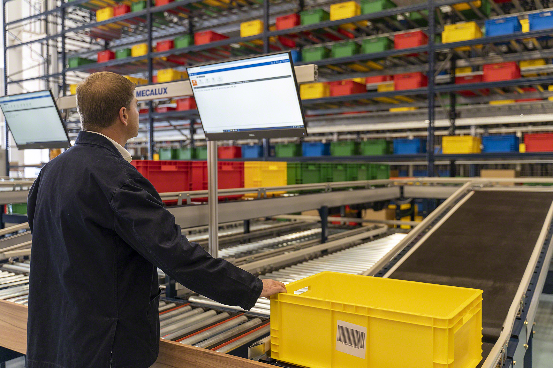 Acest sistem Shuttle este combinat cu stații de picking unde comenzile sunt pregătite conform criteriul „produs către om”. Cutiile sunt trimise automat la una dintre aceste trei stații de lucru posibile: