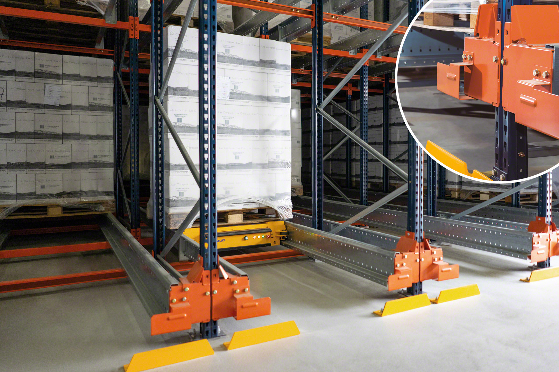- Atât structura cât și cărucioarele încorporează diferite elemente de securitate specifice pentru buna funcționare a sistemului Pallet Shuttle: opritoare de capăt de șină, dispozitive de centrare pentru paleți, senzori de poziție, sistem de blocare, etc.