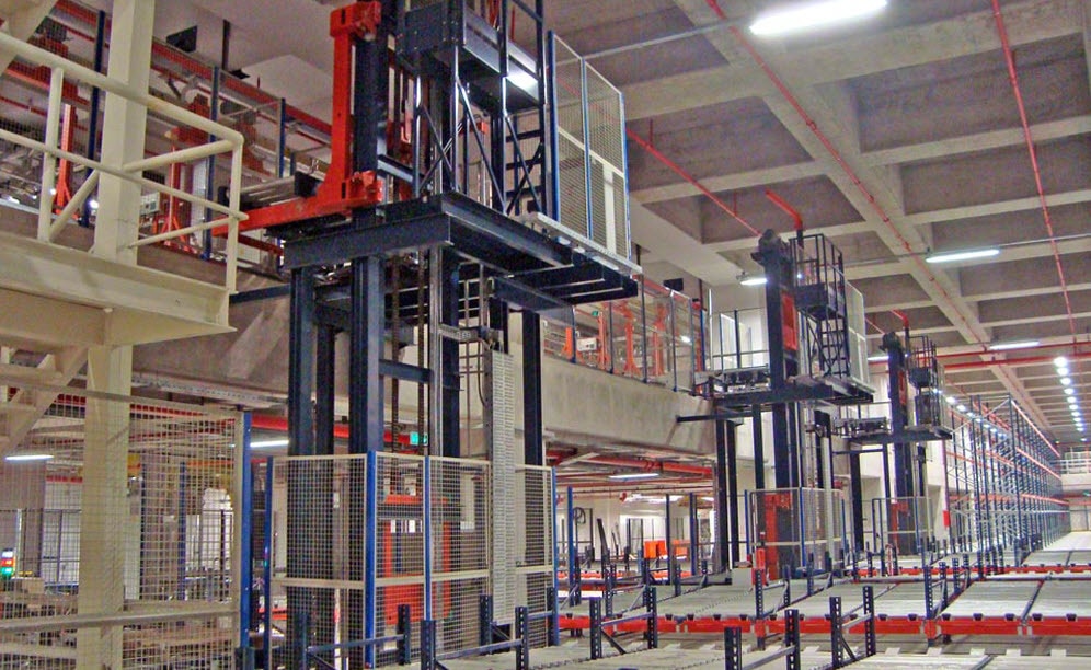 - Etajul doi: Dedicat operațiunilor de picking și împărțit în două zone: Una pentru picking manual cu rafturi convenționale pentru paleți, și alta pentru picking automat folosind canale active deservite de patru navete, pentru produse cu rotație mai mare. Mărfurile ajung în această zonă prin intermediul a patru lifturi, care le transportă de la etajul trei. Odată ce paletul este complet, acesta este balotat, etichetat și trimis, prin intermediul a două lifturi, în zona de expediere de la parter, care este deservită de șine electrice.