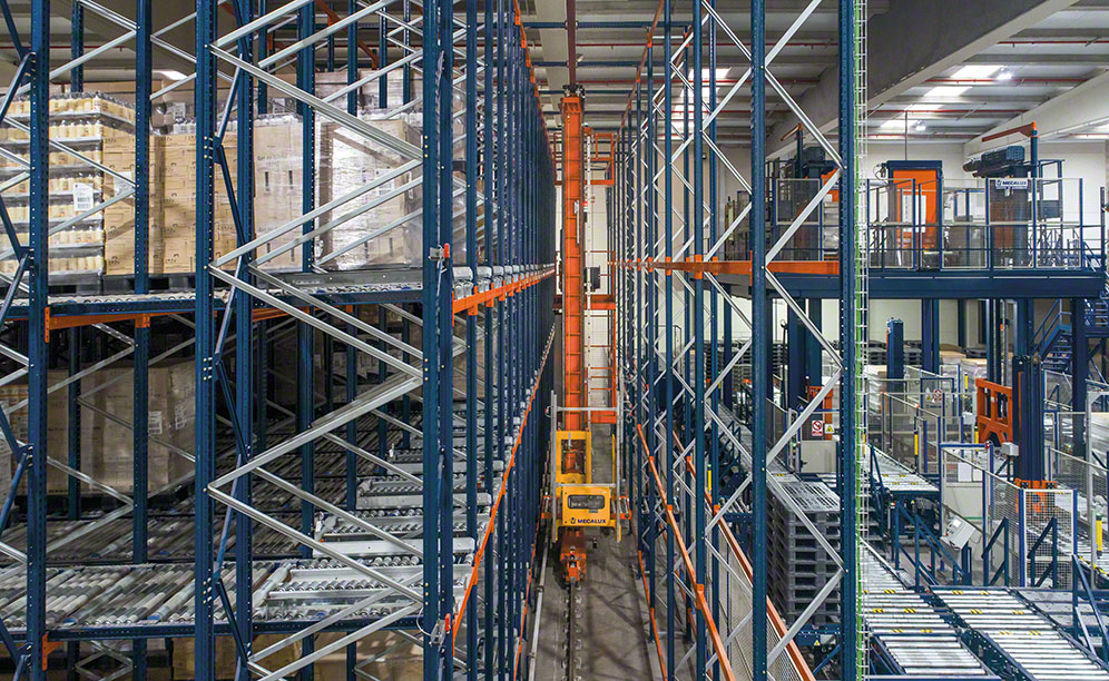 În interiorul depozitului, au fost activate trei culoare lungi de 70 m pentru ca o macara stivuitor MT3 cu două catarge să se deplaseze. Fiecare macara-stivuitor, capabilă să efectueze 24 de cicluri combinate simultane în fiecare oră, este completată de o navetă care transportă paleți până în poziția deschisă pe culoar, așa cum este indicat de software-ul de gestionare a depozitelor Easy WMS.