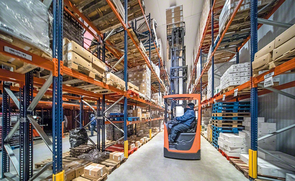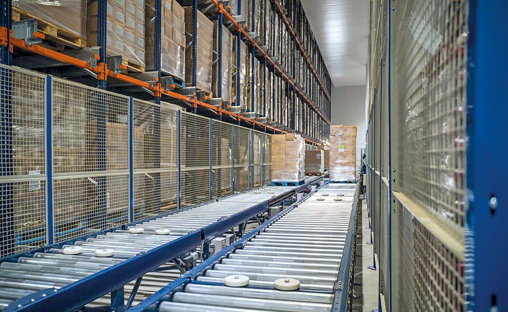 Rafturile pentru paleți reprezintă singurul sistem de depozitare instalat în toate cele trei zone. Sistemul a fost ales datorită adaptabilității sale la orice tip de sarcină, greutate și volum. În plus, accesul direct pe care îl oferă eficientizează gestionarea mărfurilor. Operația de picking a paleților se face direct de la nivelurile inferioare de depozitare cu ajutorul dispozitivelor de radiofrecvență (RF). În schimb, stocul de rezervă paletizat este plasat la nivelurile superioare ale rafturilor.