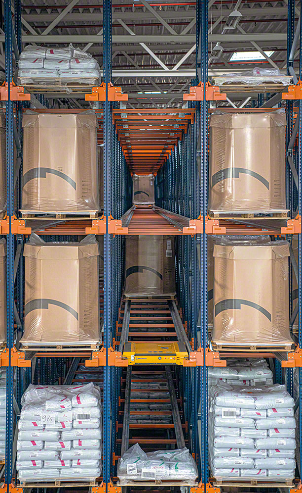 După ce a analizat caracteristicile speciale ale depozitului, Mecalux l-a echipat cu două unități de rafturi cu sistem Pallet Shuttle pentru optimizarea zonei de depozitare. Acestea au o înălțime de 9,5 m, sunt împărțite pe cinci niveluri și au o capacitate de depozitare pentru 10.695 de paleți cu o greutate unitară maximă de 1.000 kg.